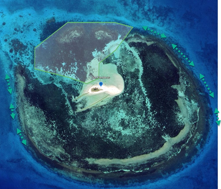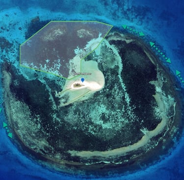 Je n'ai pas encore exploré les fonds mais le passage en bateau au bord de l'ilot m'a permis de déterminer une zone plutôt sympa à explorer et peu profonde (En vert). Les bords de l'ilot sont également à explorer Par beau temps attention à la présence de chasseur sous-marins.